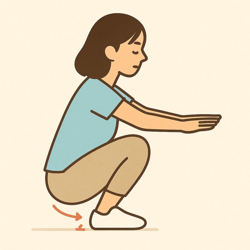 足を肩幅に開いて、かかとを床につけたまましゃがみこみます。かかとが浮いたり、後ろに倒れそうになるなら、足首が硬くなっている可能性があります。