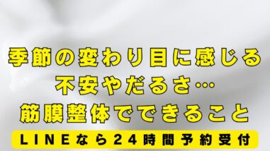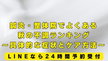ブログ 鍼灸・整体院でよくある秋の不調ランキング〜具体的な症状とケア方法〜 ブログをご覧いただきありがとうございます。内灘町で筋膜ケアに特化した施術の筋膜整体と鍼灸を受けることが出来る施術院です。今の時期は一年の中でも体の不調を訴える方が増える時期です。今回は今の時期、特に多い不調をご紹介しながら、原因や整体でのケ... 2025.09.25 ブログ
